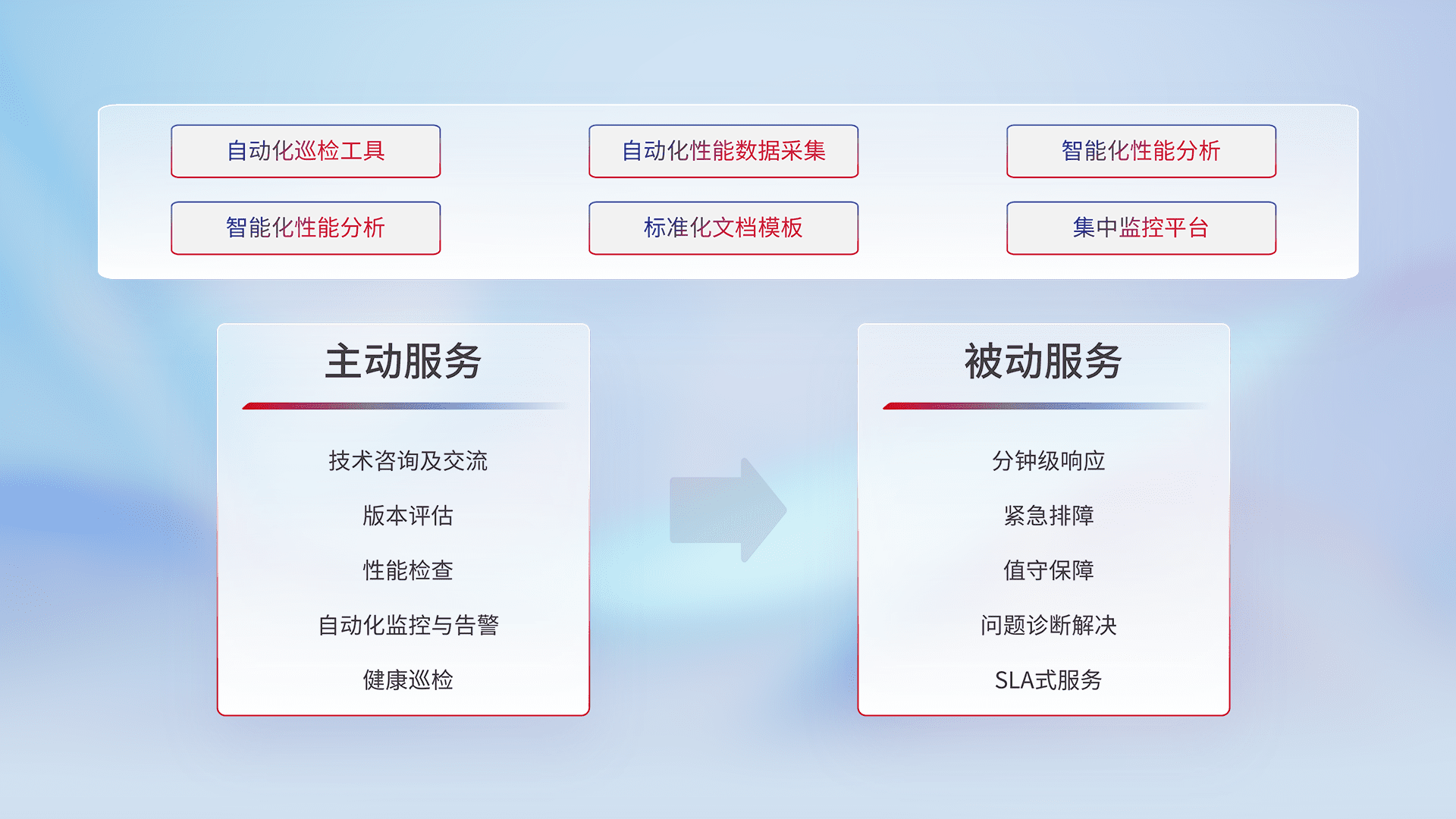 智能化工具和标准化文档,,,保障服务质量,,,提供主动服务(包含技术咨询、、、、版本评估、、性能检查、、自动化监控与告警、、健康巡检)和被动服务包含(分钟级响应、、、紧急排障、、、、值守保障、、问题诊断解决、、、SLA服务)。。。