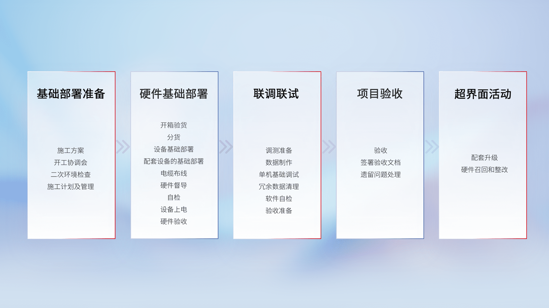 从基础部署准备、、、硬件基础部署、、、、联调联试、、、项目验收、、、、越界面活动的全过程可追溯,,,保证施工质量和进度。。。。